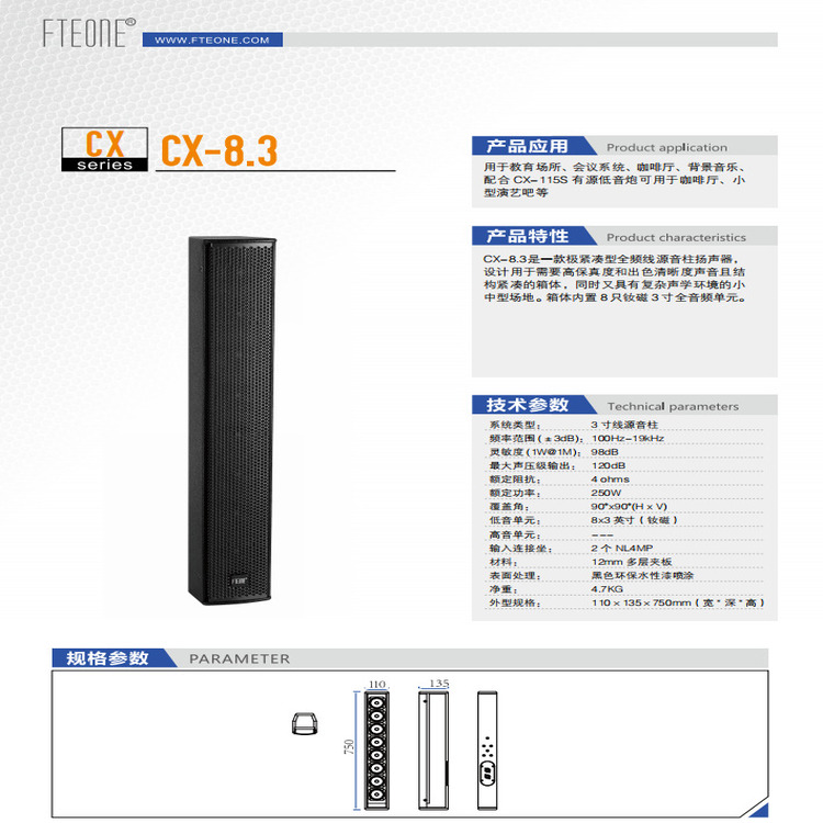教育场所、会议系统、咖啡厅、背景音乐、配合CX-115S有源低音炮可用于咖啡厅、小型演艺吧等