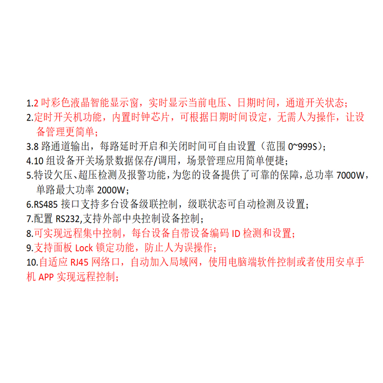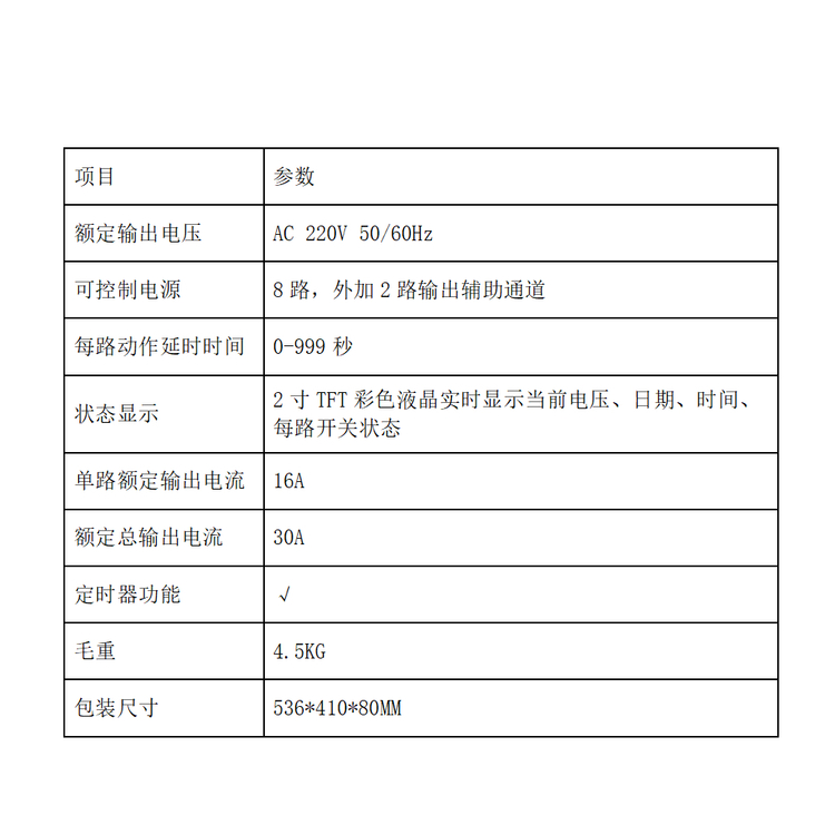 状态显示 | 2寸TFT彩色液晶实时显示当前电压、日期、时间、每路开关状态 |