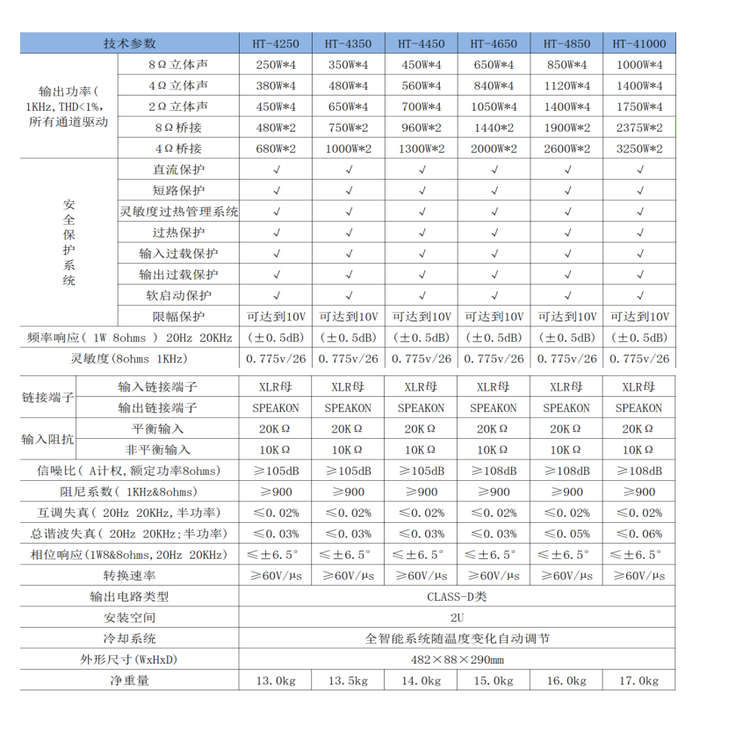 HT系列是一个符合高标准超高品质的专业功率放大器。声音性能不仅足以媲美最好的高保真音响功率放大器,而且只会比其更加强大。增加了额外维度的低音力度,确保非常准确再现一个自然宽广的耦合瞬态户外演出/酒吧/礼堂剧场